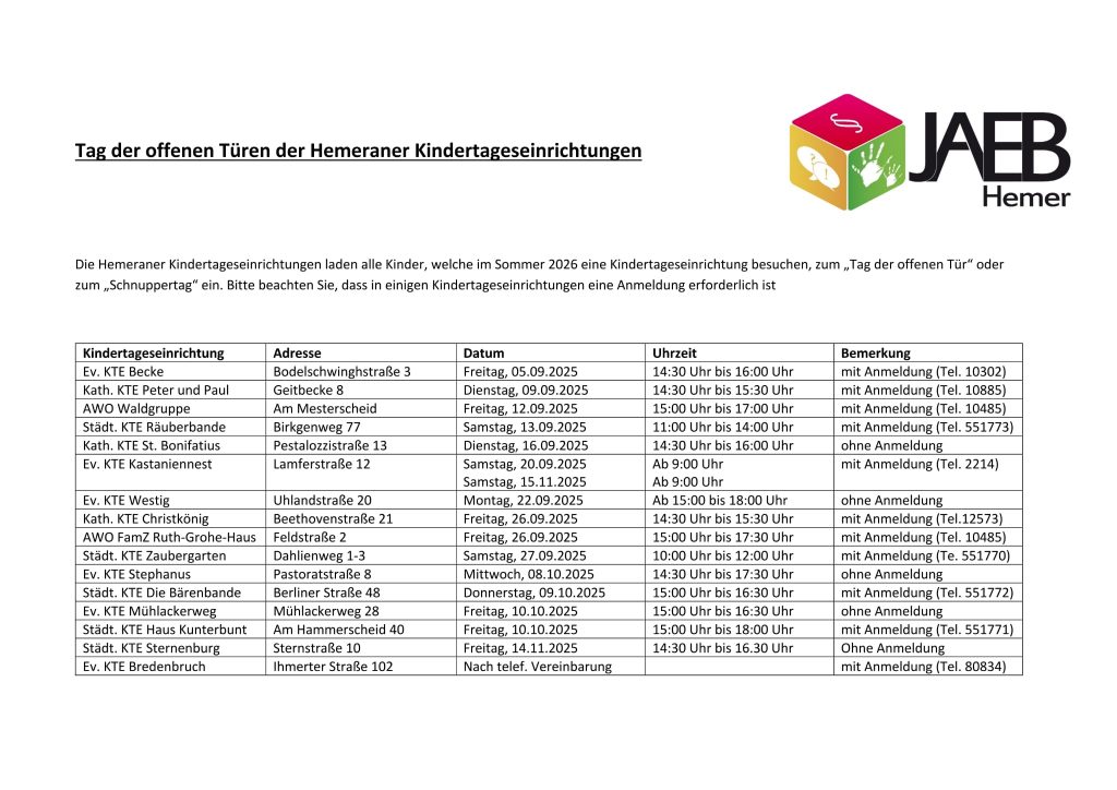 Im September, Oktober und November 25 laden die Kindertageseinrichtungen in Hemer alle interessierten Eltern für das Kindergartenjahr 26/27 zum Tag der offenen Tür ein. Für einige Einrichtungen ist eine Anmeldung erforderlich.